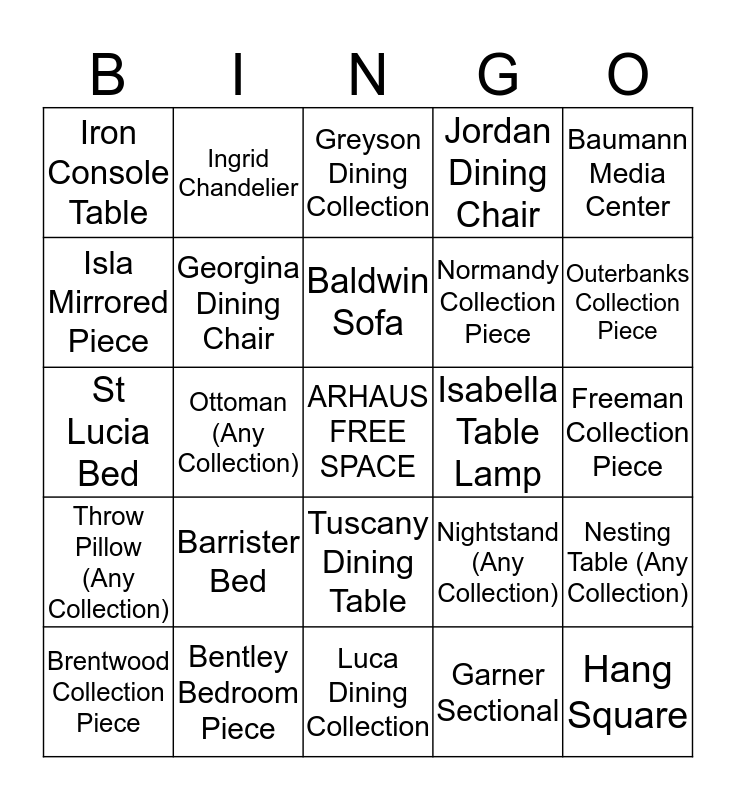 This bingo card has a free space and 24 words: Barrister Bed, Bentley Bedroom Piece, Baldwin Sofa, Brentwood Collection Piece, Baumann Media Center, Iron Console Table, Isla Mirrored Piece, Ingrid Chandelier, Isabella Table Lamp, Tuscany Dining Table, Normandy Collection Piece, St Lucia Bed, Nightstand (Any Collection), Nesting Table (Any Collection), Georgina Dining Chair, Garner Sectional, Freeman Collection Piece, Greyson Dining Collection, Outerbanks Collection Piece, Ottoman (Any Collection), Hang Square, Throw Pillow (Any Collection), Jordan Dining Chair and Luca Dining Collection.