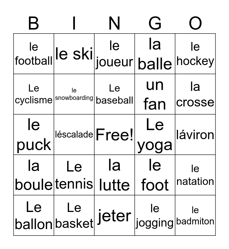 This bingo card has a free space and 24 words: Le tennis, Le basket, Le baseball, Le ballon, le hockey, le football, Le cyclisme, le ski, Le yoga, la lutte, un fan, le puck, le foot, le natation, le snowboarding, le jogging, láviron, le joueur, la crosse, léscalade, le badmiton, la boule, la balle and jeter.
