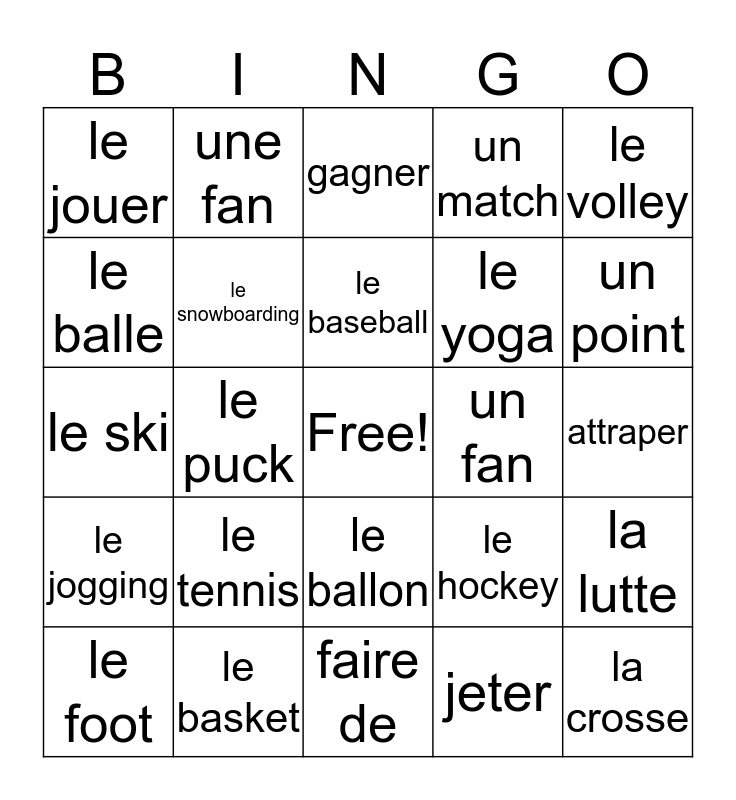 This bingo card has a free space and 24 words: le tennis, le basket, le baseball, le foot, le volley, le jouer, le balle, une fan, un fan, le ballon, le yoga, le ski, le hockey, la lutte, le snowboarding, jeter, attraper, gagner, un point, le puck, la crosse, le jogging, un match and faire de.
