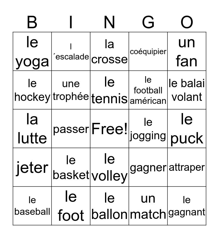 This bingo card has a free space and 24 words: le basket, le foot, le tennis, le baseball, un fan, le yoga, le hockey, l´escalade, le jogging, le volley, le football américan, la lutte, gagner, attraper, une trophée, un match, le puck, la crosse, le balai volant, passer, le gagnant, jeter, coéquipier and le ballon.