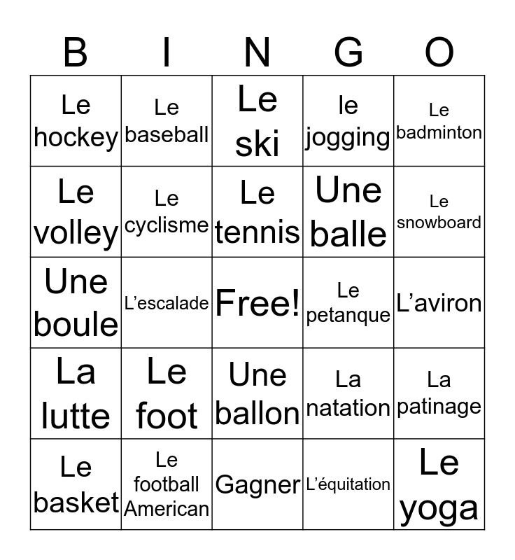 This bingo card has a free space and 24 words: Le foot, Le football American, Le tennis, Le basket, Le badminton, Le hockey, Le volley, Le baseball, Le petanque, Une ballon, Une balle, Une boule, La natation, La patinage, Le cyclisme, L’équitation, L’aviron, Le ski, Le snowboard, L’escalade, Le yoga, La lutte, le jogging and Gagner.