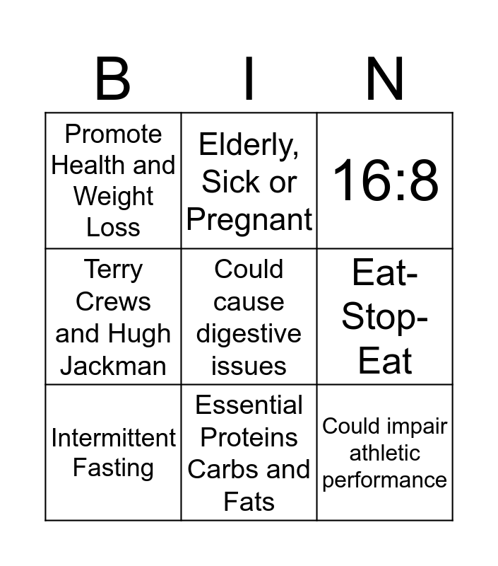 This bingo card has 9 words: Intermittent Fasting, 16:8, Elderly, Sick or Pregnant, Terry Crews and Hugh Jackman, Promote Health and Weight Loss, Eat-Stop-Eat, Could cause digestive issues, Could impair athletic performance and Essential Proteins Carbs and Fats.