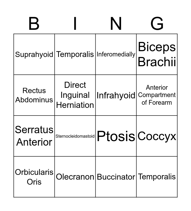This bingo card has 19 words: Ptosis, OrbicularisOculi, Inferomedially, Temporalis, Coccyx, Rectus Abdominus, Buccinator, Suprahyoid, Temporalis, Serratus Anterior, Sternocleidomastoid, Direct Inguinal Herniation, Infrahyoid, Olecranon, Orbicularis Oris, Extensors, Biceps Brachii, Anterior Compartment of Forearm and Fibularis Brevis.