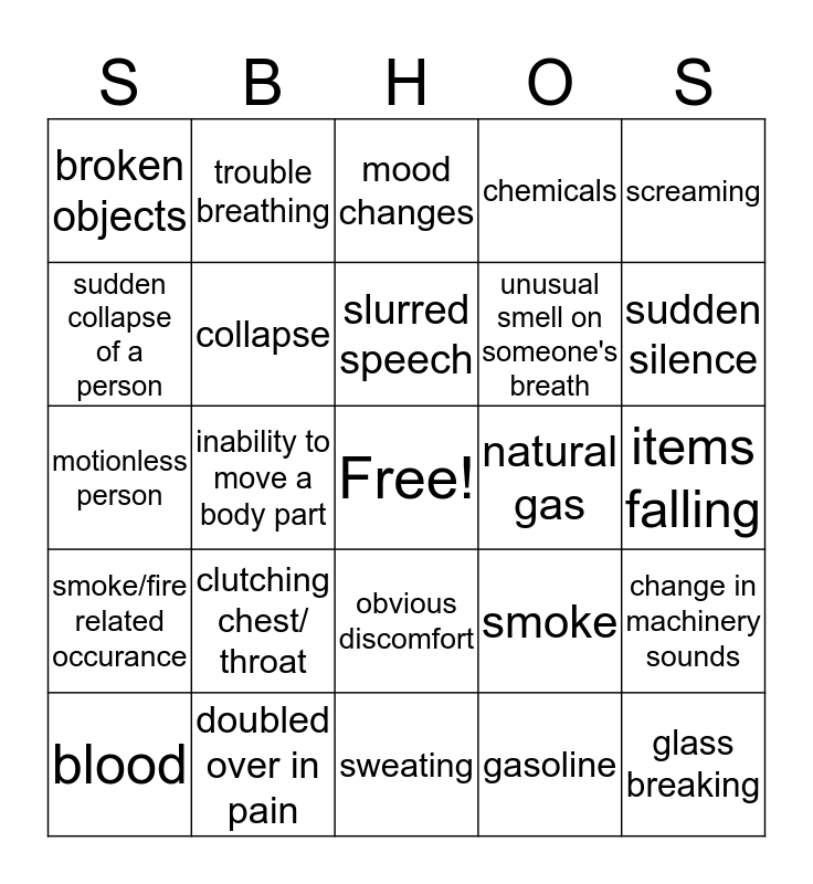 This bingo card has a free space and 24 words: blood, clutching chest/ throat, slurred speech, gasoline, screaming, broken objects, trouble breathing, mood changes, natural gas, items falling, motionless person, collapse, smoke, change in machinery sounds, sudden collapse of a person, doubled over in pain, sweating, chemicals, sudden silence, smoke/fire related occurance, inability to move a body part, obvious discomfort, unusual smell on someone's breath and glass breaking.