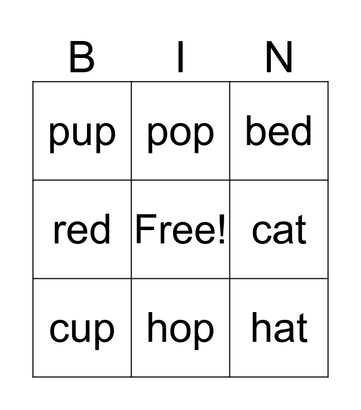 This bingo card has a free space and 8 words: cat, bed, pop, cup, pup, hat, red and hop.