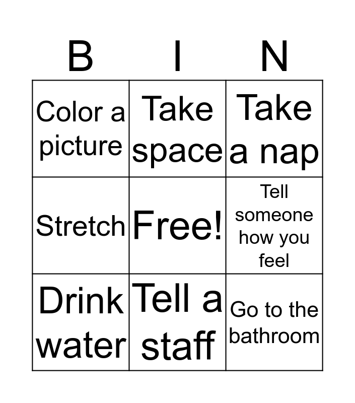 This bingo card has a free space and 11 words: Take 3 deep breaths, Tell a staff, Go to the bathroom, Drink water, Take space, Take a nap, Tell someone how you feel, Safe hands, Stretch, Color a picture and Safe feet.