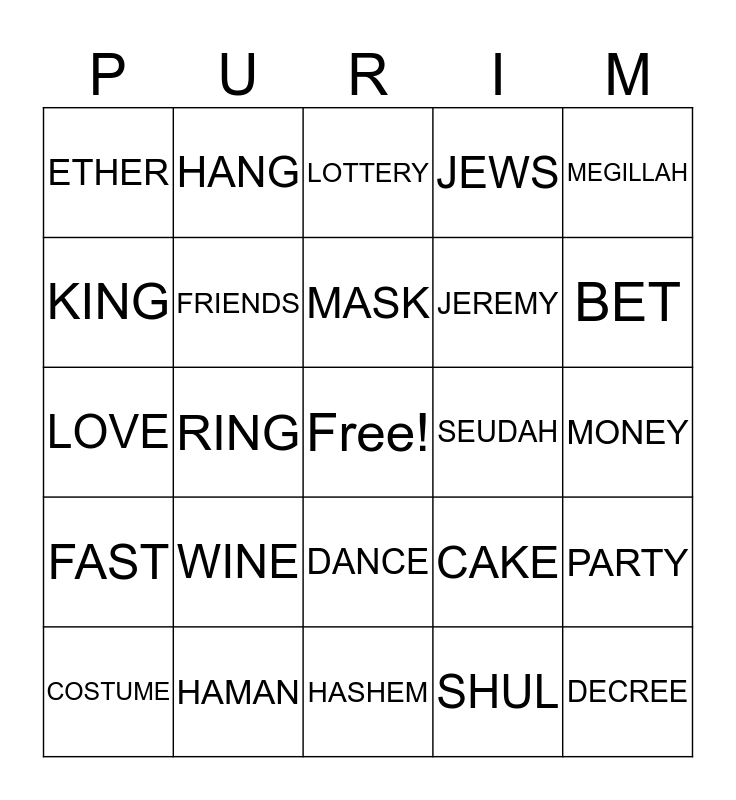 This bingo card has a free space and 24 words: WINE, HAMAN, MASK, COSTUME, MEGILLAH, ETHER, KING, HANG, SEUDAH, DANCE, JEREMY, LOVE, CAKE, PARTY, FRIENDS, SHUL, MONEY, LOTTERY, BET, RING, DECREE, FAST, JEWS and HASHEM.