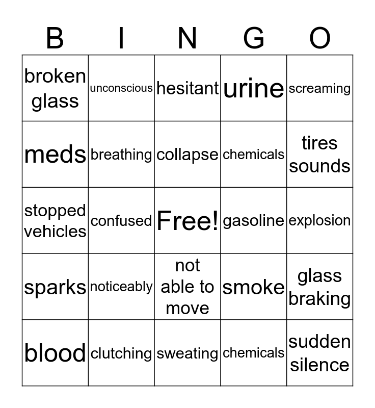 This bingo card has a free space and 24 words: blood, noticeably, collapse, chemicals, screaming, broken glass, unconscious, hesitant, gasoline, explosion, stopped vehicles, breathing, smoke, glass braking, meds, clutching, sweating, urine, tires sounds, sparks, confused, not able to move, chemicals and sudden silence.