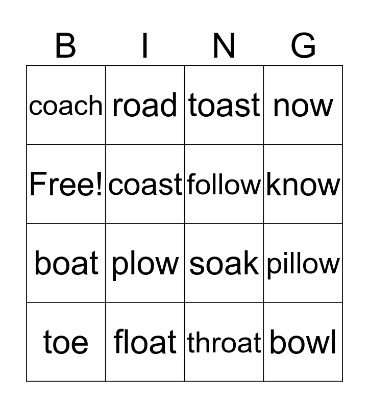 This bingo card has 16 words: float, pillow, toast, coach, boat, road, soak, throat, Free!, coast, toe, now, plow, know, follow and bowl.