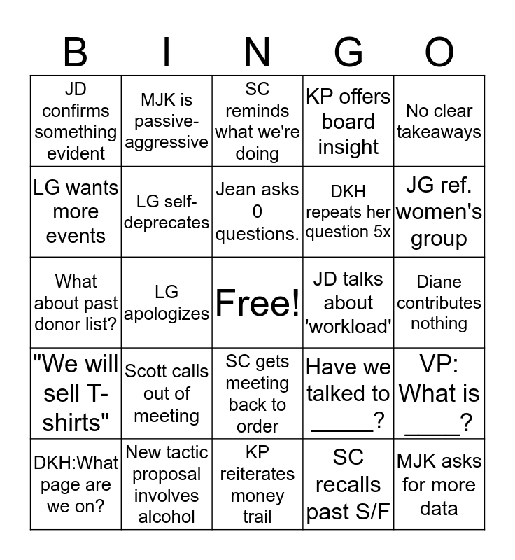This bingo card has a free space and 29 words: DKH:What page are we on?, DKH:What are we looking at?, LG apologizes, JG references instagram, JD confirms something evident, SC reminds what we're doing, LG self-deprecates, Scott calls out of meeting, JD talks about 'workload', New tactic proposal involves alcohol, Diane contributes nothing, MJK asks for more data, KP reiterates money trail, SC recalls past S/F, JG ref. women's group, VP asks about branding, SC gets meeting back to order, "We will sell T-shirts", No clear takeaways, What about past donor list?, Have we talked to _____?, Goal: more followers on f.book, DKH repeats her question 5x, LG wants more events, KP offers board insight, MJK is passive-aggressive, VP: What is ____?, Jean asks 0 questions. and SC: rem. of basic event calendar.