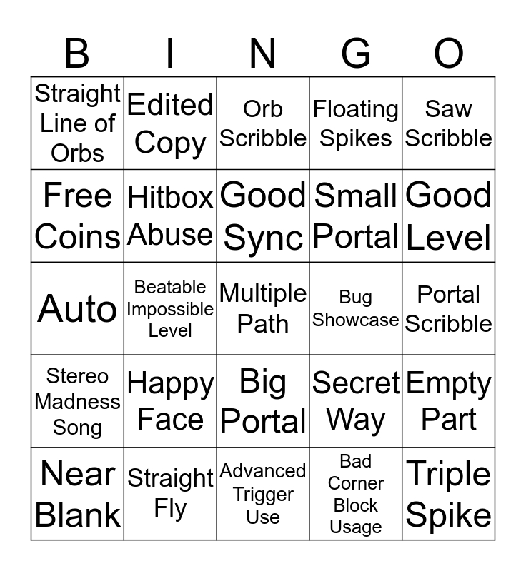 This bingo card has 25 words: Happy Face, Advanced Trigger Use, Good Sync, Near Blank, Saw Scribble, Straight Line of Orbs, Free Coins, Edited Copy, Bug Showcase, Big Portal, Small Portal, Auto, Secret Way, Empty Part, Hitbox Abuse, Triple Spike, Portal Scribble, Orb Scribble, Good Level, Beatable Impossible Level, Multiple Path, Straight Fly, Stereo Madness Song, Floating Spikes and Bad Corner Block Usage.