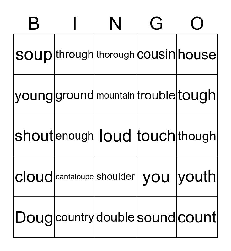 This bingo card has a free space and 24 words: cantaloupe, country, mountain, Doug, house, soup, young, through, touch, shoulder, trouble, shout, you, youth, ground, sound, though, thorough, tough, enough, count, cloud, cousin and double.