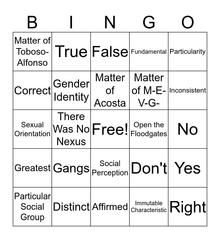 This bingo card has a free space and 24 words: Particular Social Group, Gangs, Matter of Acosta, Immutable Characteristic, Particularity, Matter of Toboso-Alfonso, True, False, Open the Floodgates, No, Sexual Orientation, Gender Identity, Don't, Yes, Correct, Distinct, Affirmed, Fundamental, Inconsistent, Greatest, There Was No Nexus, Social Perception, Matter of M-E-V-G- and Right.