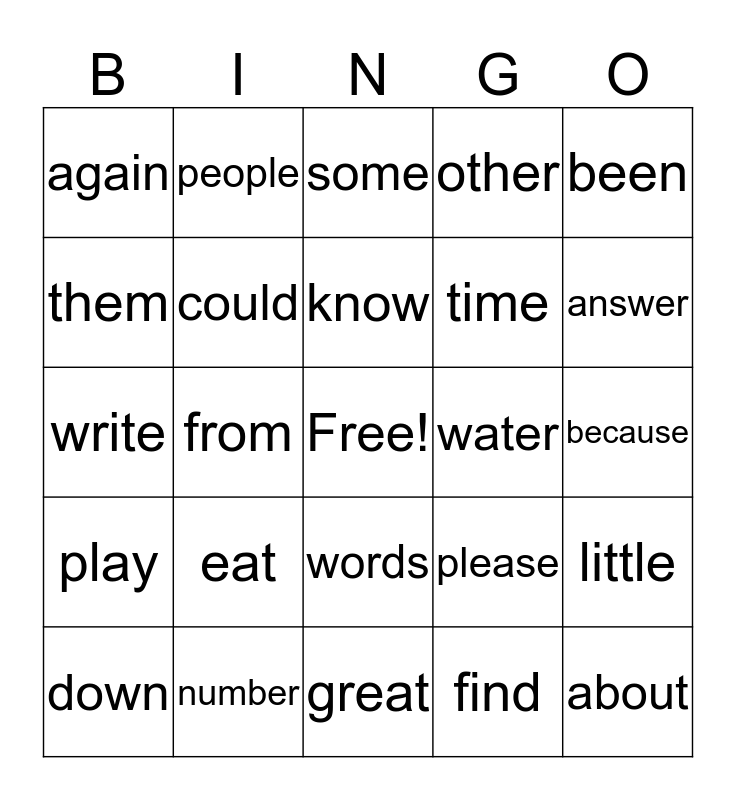 This bingo card has a free space and 24 words: eat, number, know, down, been, again, them, people, water, words, time, write, please, little, could, find, because, some, answer, from, about, play, other and great.