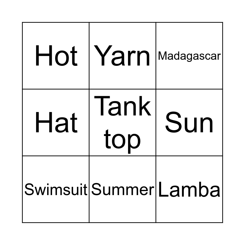 This bingo card has a free space and 13 words: Sunglasses, T-shirt, Swimsuit, Yarn, Hat, Lamba, Sandals, Shorts, Summer, Hot, Sun, Madagascar and The Maya.