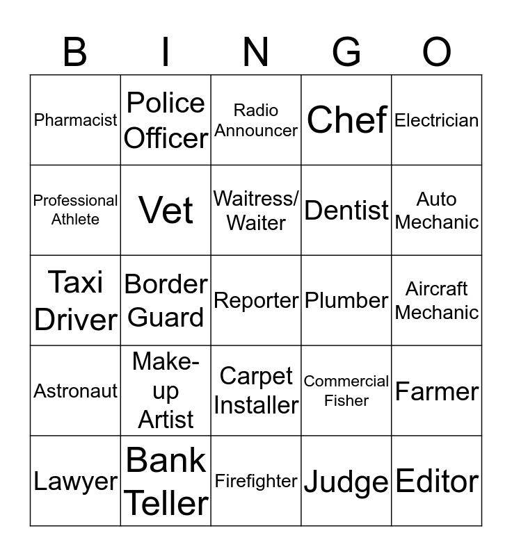 This bingo card has a free space and 24 words: Lawyer, Make-up Artist, Waitress/ Waiter, Judge, Electrician, Pharmacist, Police Officer, Radio Announcer, Plumber, Aircraft Mechanic, Taxi Driver, Vet, Commercial Fisher, Farmer, Professional Athlete, Bank Teller, Firefighter, Chef, Auto Mechanic, Astronaut, Border Guard, Carpet Installer, Dentist and Editor.