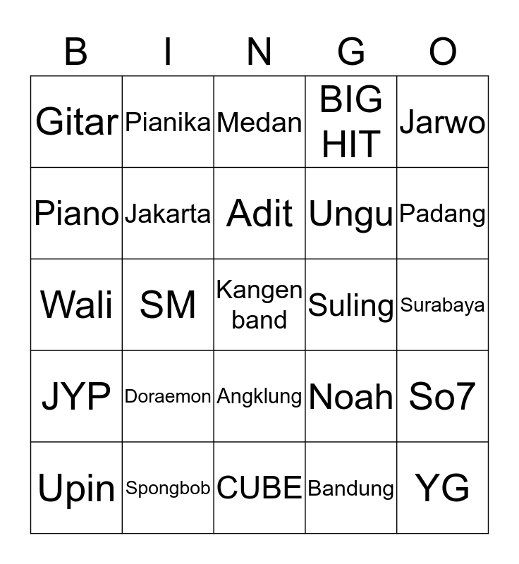 This bingo card has a free space and 24 words: Doraemon, Spongbob, Adit, Upin, Jarwo, Gitar, Piano, Pianika, Suling, Angklung, Ungu, Wali, Noah, So7, Jakarta, Bandung, Surabaya, Medan, Padang, SM, YG, JYP, BIG HIT and CUBE.