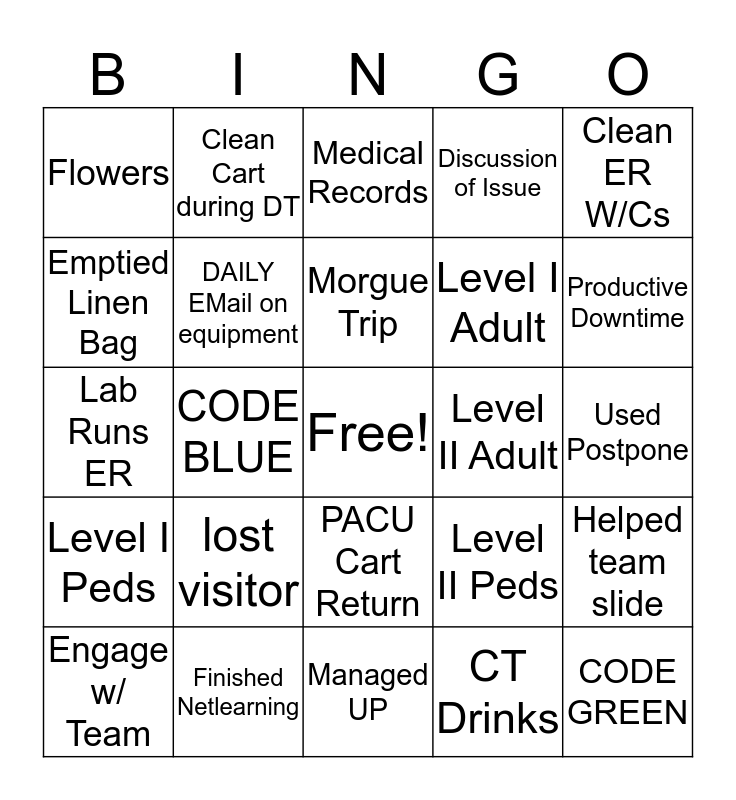 This bingo card has a free space and 24 words: lost visitor, Finished Netlearning, Morgue Trip, Engage w/ Team, Clean ER W/Cs, Flowers, Emptied Linen Bag, Clean Cart during DT, Level II Adult, PACU Cart Return, Level I Adult, Lab Runs ER, Level II Peds, Helped team slide, DAILY EMail on equipment, CT Drinks, Used Postpone, Medical Records, Productive Downtime, CODE BLUE, CODE GREEN, Level I Peds, Discussion of Issue and Managed UP.