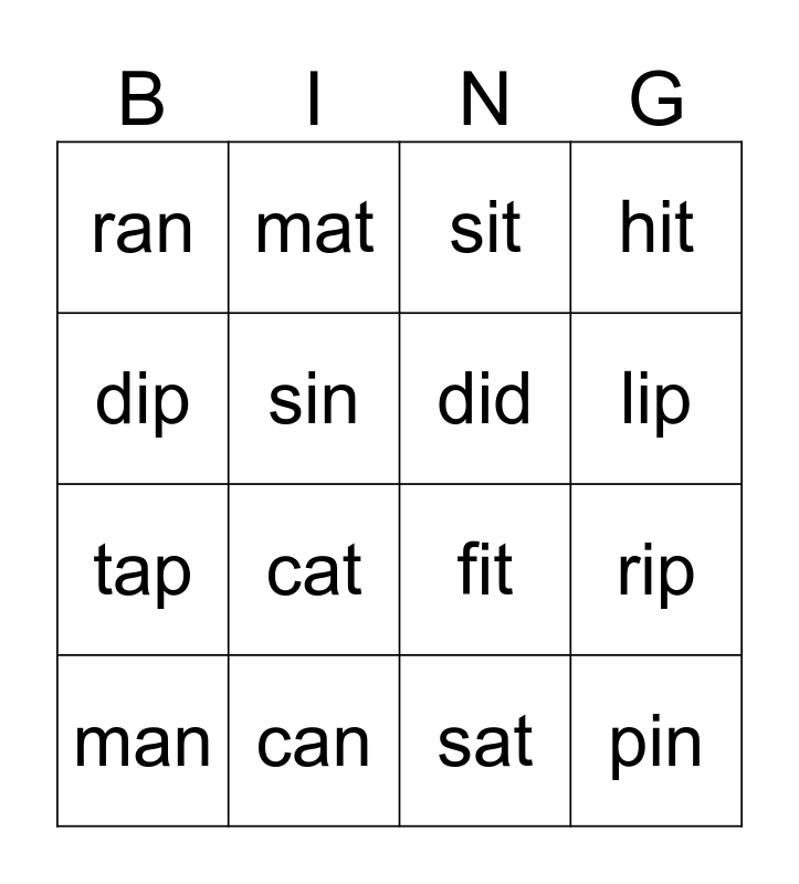 This bingo card has 16 words: can, rip, sit, ran, tap, mat, fit, sat, dip, sin, man, hit, cat, lip, did and pin.