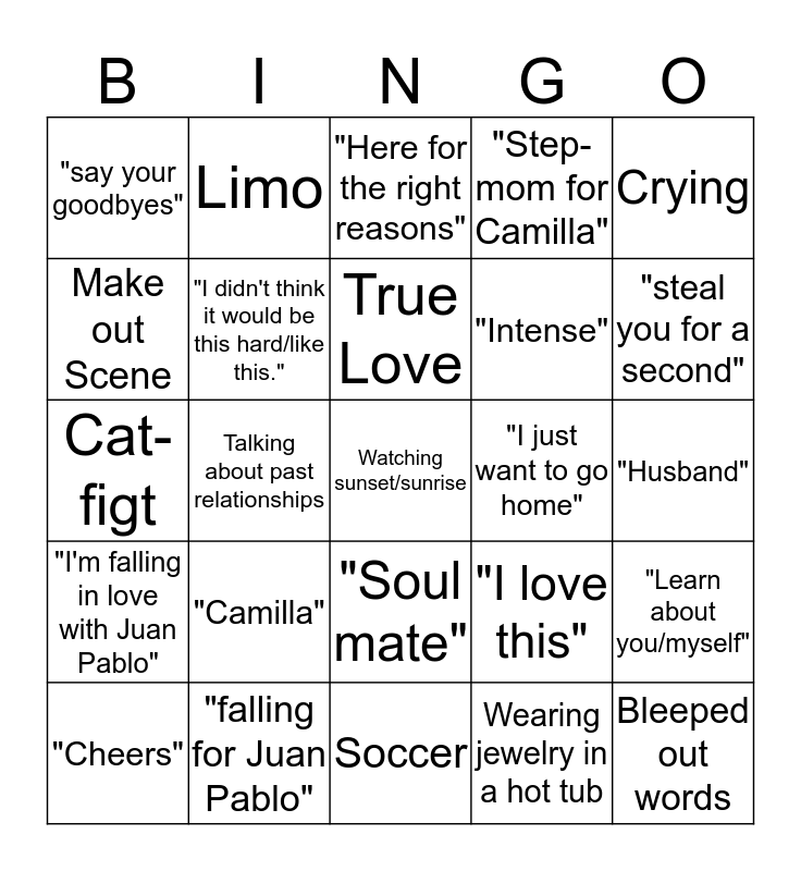 This bingo card has 25 words: "Camilla", Soccer, True Love, "Cheers", Crying, "say your goodbyes", Make out Scene, Limo, "I just want to go home", "Soul mate", "Intense", Cat-figt, "I love this", "Learn about you/myself", "I didn't think it would be this hard/like this.", Bleeped out words, "Husband", "Here for the right reasons", "steal you for a second", Talking about past relationships, Watching sunset/sunrise, "falling for Juan Pablo", "I'm falling in love with Juan Pablo", "Step-mom for Camilla" and Wearing jewelry in a hot tub.