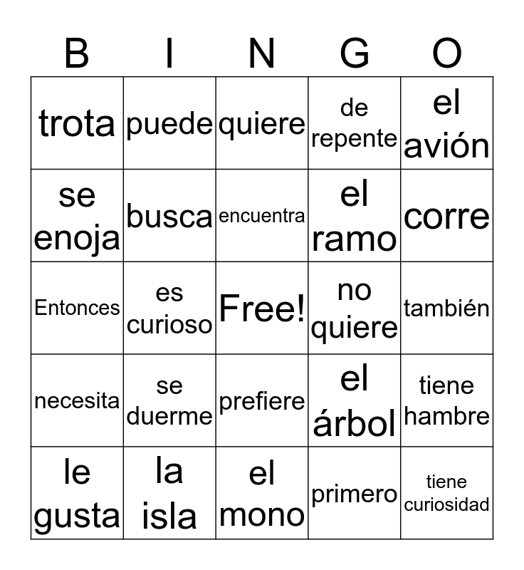 This bingo card has a free space and 27 words: el árbol, la rama, el ramo, el mono, se enoja, quiere, puede, necesita, no quiere, tiene hambre, Entonces, de repente, le gusta, la isla, corre, se cae, busca, encuentra, se duerme, trota, también, primero, es curioso, tiene curiosidad, prefiere, el avión and el barco.