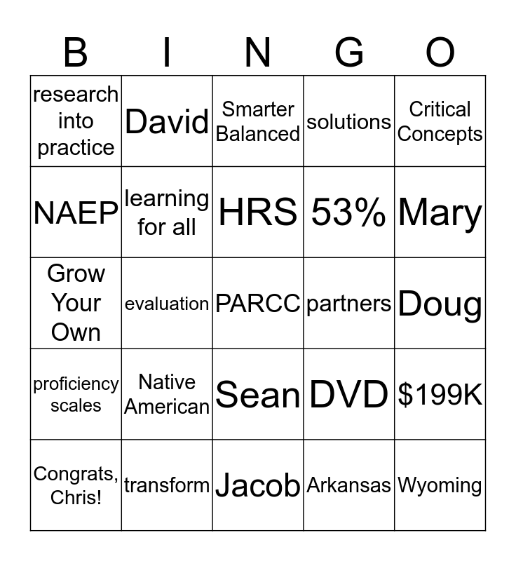This bingo card has 62 words: education systems, transform, ACT, proficiency scales, Wyoming, learners, learning for all, SAT, 53%, California, solutions, item analysis, NAEP, Texas, Jeff Flygare, research into practice, PARCC, Critical Concepts, Iowa, HRS, partners, Smarter Balanced, Congrats, Chris!, Arkansas, coaching, Marzano Training Center, $746K, $53K, $199K, CDI, research, technical assistance, data dashboard, theory of change, Doug, David, rural, Marc, evaluation, teacher pipeline, Grow Your Own, conference, Native American, Twitter, Mary, DVD, strengths, aniversaries, birthdays, Jonathan, Sean, Jacob, Lyn, Kyle, Becky, Shaundi, Trudy, pot luck, words of wisdom, Bob, Kill-a-Marzano and Kilimanjaro.
