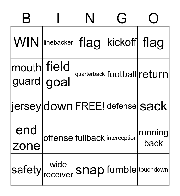 This bingo card has a free space and 27 words: interception, Falcons, football, snap, mouth guard, flag, linebacker, end zone, defense, running back, jersey, kickoff, safety, wide receiver, return, punt, field goal, quarterback, offense, WIN, sack, fumble, down, touchdown, fullback, flag and helmet.