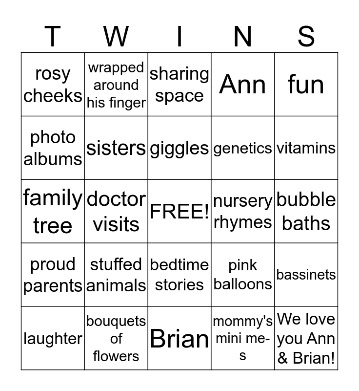 This bingo card has a free space and 24 words: stuffed animals, bouquets of flowers, giggles, laughter, fun, rosy cheeks, photo albums, wrapped around his finger, nursery rhymes, bedtime stories, genetics, family tree, pink balloons, bassinets, sisters, mommy's mini me-s, bubble baths, sharing space, vitamins, doctor visits, We love you Ann & Brian!, proud parents, Ann and Brian.