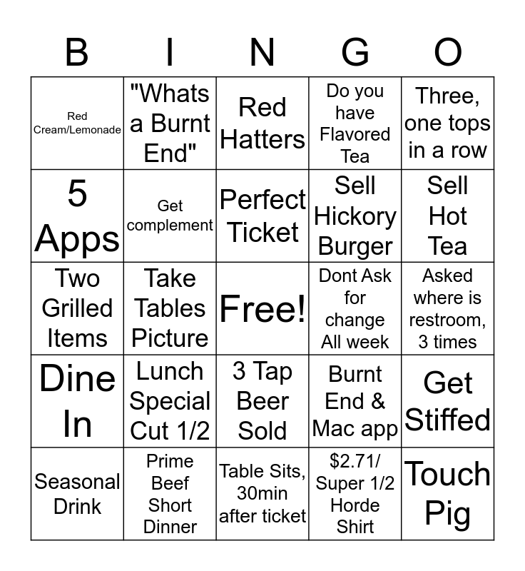 This bingo card has a free space and 24 words: Lunch Special Cut 1/2, Prime Beef Short Dinner, Perfect Ticket, Seasonal Drink, Three, one tops in a row, Red Cream/Lemonade, 5 Apps, "Whats a Burnt End", Dont Ask for change All week, 3 Tap Beer Sold, Sell Hickory Burger, Two Grilled Items, Burnt End & Mac app, Get Stiffed, Get complement, $2.71/ Super 1/2 Horde Shirt, Asked where is restroom, 3 times, Red Hatters, Sell Hot Tea, Take Tables Picture, Touch Pig, Dine In, Do you have Flavored Tea and Table Sits, 30min after ticket.