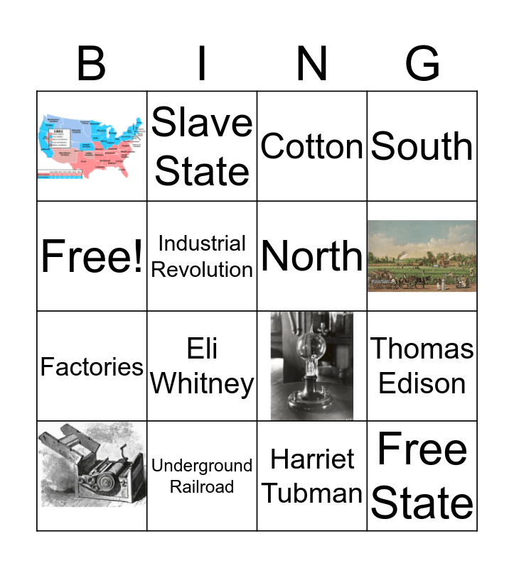 This bingo card has 4 images and 12 words: Underground Railroad, Thomas Edison, Cotton, Factories, Slave State, Harriet Tubman, Free!, Industrial Revolution, South, Eli Whitney, North and Free State.