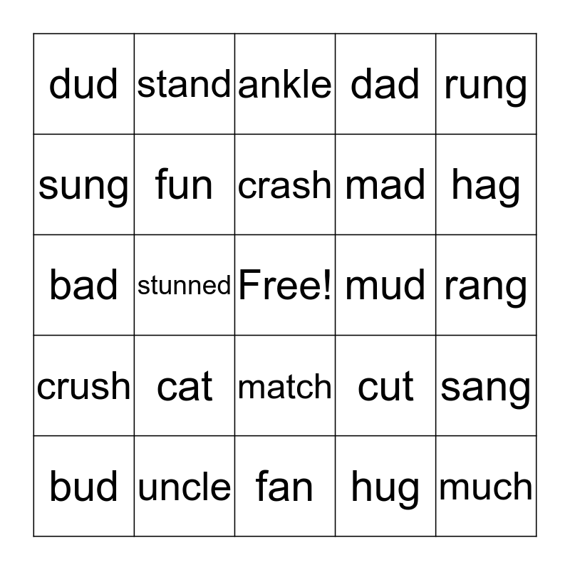 This bingo card has a free space and 24 words: cat, uncle, crash, bud, rung, dud, sung, stand, mud, match, mad, bad, cut, sang, fun, hug, rang, ankle, hag, stunned, much, crush, dad and fan.