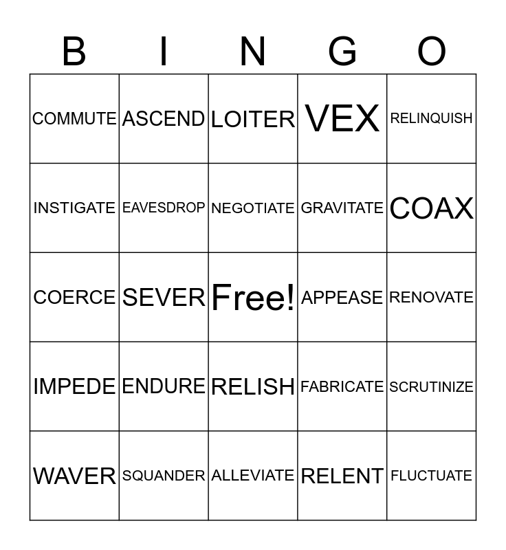 This bingo card has a free space and 36 words: ACCENTUATE, APPREHEND, CONCUR, EAVESDROP, FABRICATE, IMPEDE, NEGOTIATE, PERMEATE, RELINQUISH, SAUNTER, SEVER, VEX, ABATE, APPEASE, COAX, COMMUTE, DEPLORE, ENDURE, FLUCTUATE, LOITER, RENOVATE, SCRUTINIZE, SQUANDER, WAVER, ALLEVIATE, ASCEND, COERCE, COLLABORATE, GRAVITATE, INSTIGATE, OUST, PLUMMET, RELENT, RELISH, SUSTAIN and VIE.
