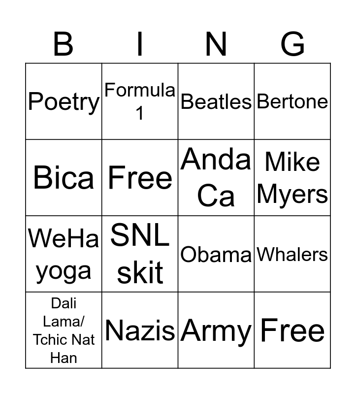 This bingo card has 16 words: Nazis, Whalers, Beatles, Poetry, WeHa yoga, Formula 1, Obama, Army, Bica, Free, Dali Lama/ Tchic Nat Han, Bertone, SNL skit, Mike Myers, Anda Ca and Free.