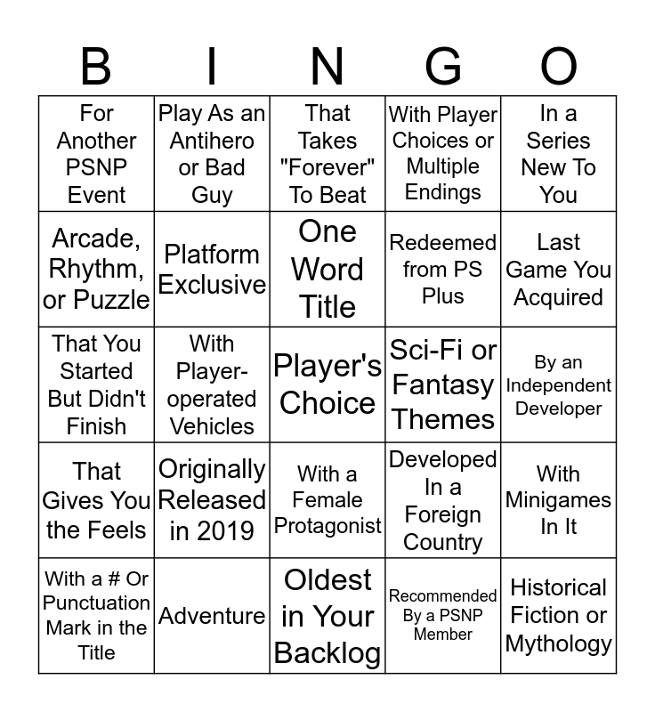 This bingo card has a free space and 24 words: Originally Released in 2019, Adventure, One Word Title, With a # Or Punctuation Mark in the Title, In a Series New To You, For Another PSNP Event, Arcade, Rhythm, or Puzzle, Play As an Antihero or Bad Guy, Sci-Fi or Fantasy Themes, With a Female Protagonist, Redeemed from PS Plus, That You Started But Didn't Finish, Developed In a Foreign Country, With Minigames In It, Platform Exclusive, Recommended By a PSNP Member, By an Independent Developer, That Takes "Forever" To Beat, Last Game You Acquired, With Player-operated Vehicles, Historical Fiction or Mythology, That Gives You the Feels, With Player Choices or Multiple Endings and Oldest in Your Backlog.