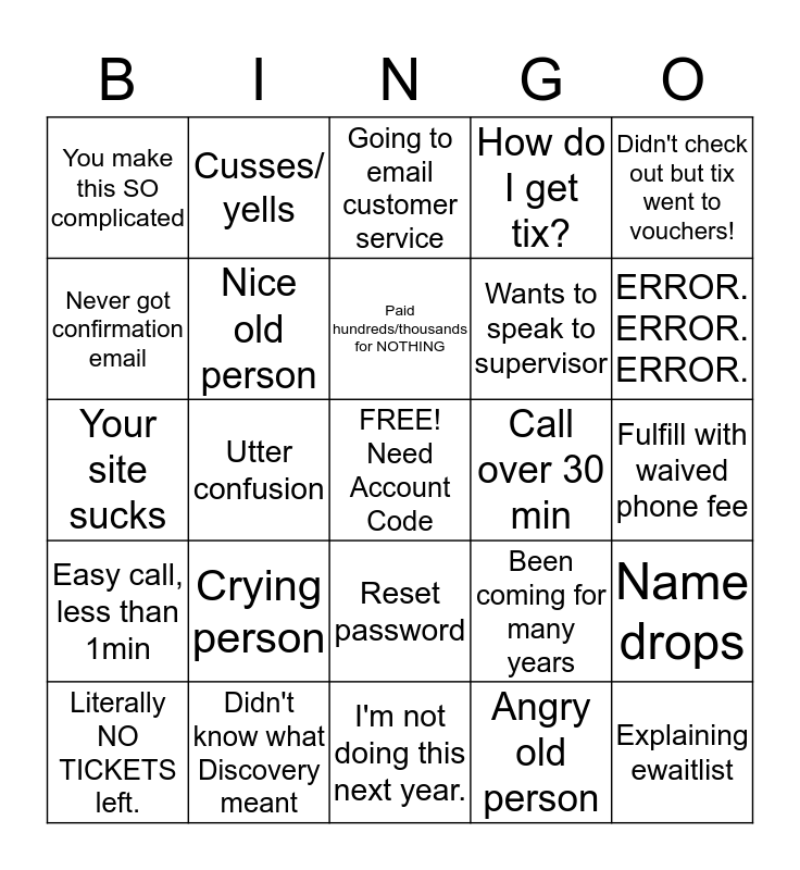 This bingo card has a free space and 24 words: Crying person, Didn't know what Discovery meant, Paid hundreds/thousands for NOTHING, Literally NO TICKETS left., Didn't check out but tix went to vouchers!, You make this SO complicated, Never got confirmation email, Cusses/ yells, Call over 30 min, Reset password, Wants to speak to supervisor, Your site sucks, Been coming for many years, Name drops, Nice old person, Angry old person, Fulfill with waived phone fee, Going to email customer service, ERROR. ERROR. ERROR., Utter confusion, Explaining ewaitlist, Easy call, less than 1min, How do I get tix? and I'm not doing this next year..
