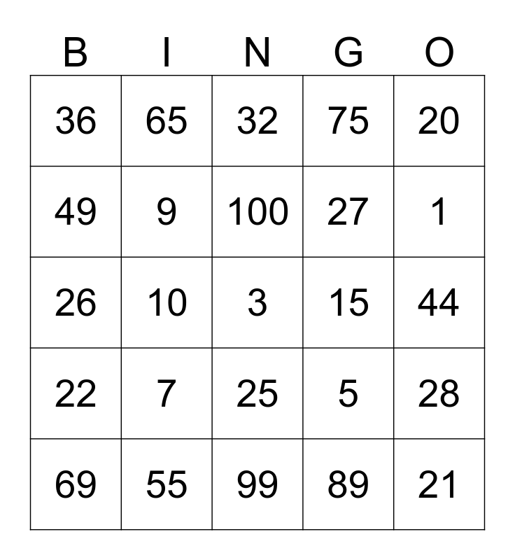 This bingo card has a free space and 24 words: 7, 55, 100, 69, 20, 36, 49, 65, 15, 25, 27, 26, 5, 28, 9, 89, 44, 32, 1, 10, 21, 22, 75 and 99.