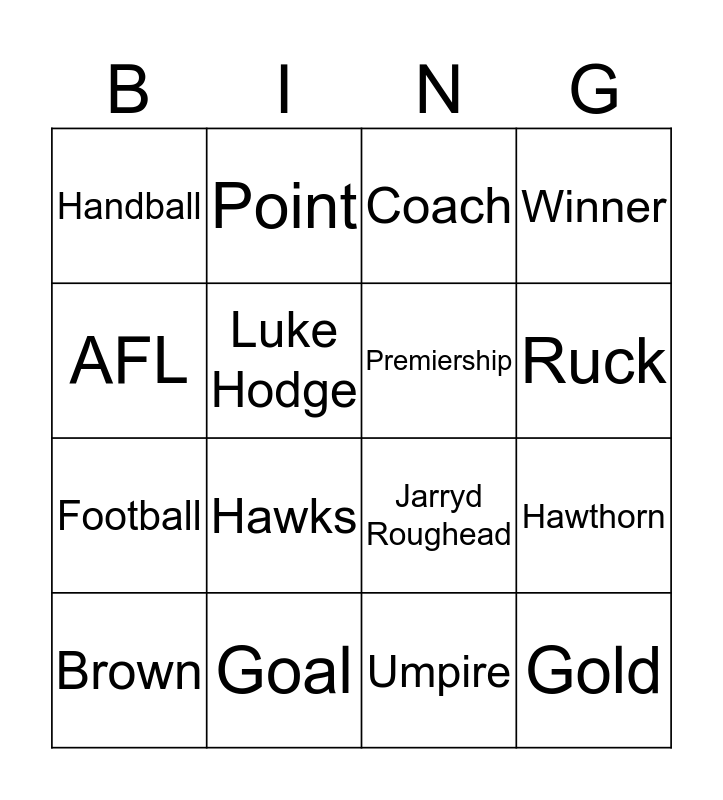 This bingo card has 24 words: Alastair Clarkson, Forward, Ruck, Kick, AFL, Handball, Luke Hodge, Point, Goal, Tackle, Football, Jarryd Roughead, Cyril Rioli, Sam Mitchell, Premiership, Flag, Umpire, Coach, Hawks, Hawthorn, Brown, Gold, Winner and Match.