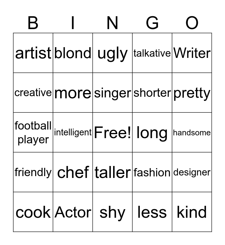 This bingo card has a free space and 24 words: chef, Actor, singer, cook, Writer, artist, creative, blond, long, taller, shorter, football player, fashion, designer, more, less, handsome, ugly, pretty, intelligent, kind, friendly, talkative and shy.