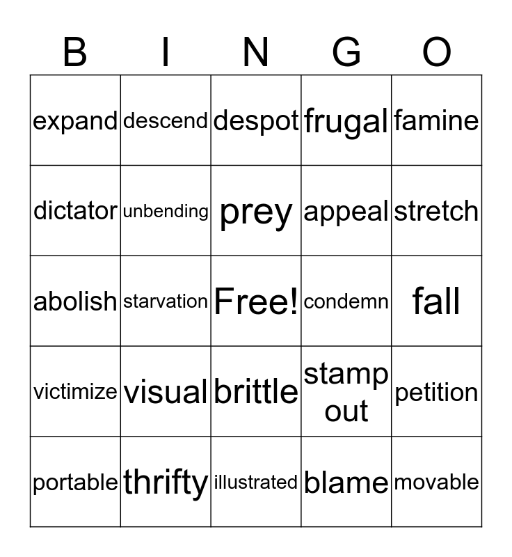 This bingo card has a free space and 24 words: visual, thrifty, prey, portable, famine, expand, dictator, descend, condemn, brittle, appeal, abolish, stamp out, petition, unbending, blame, fall, despot, stretch, starvation, movable, victimize, frugal and illustrated.