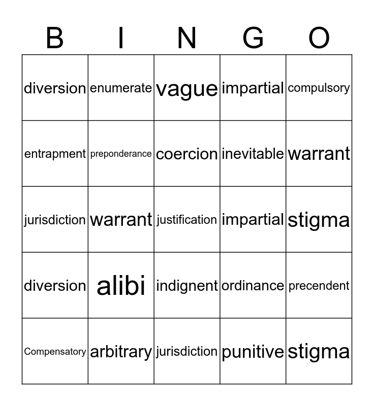 This bingo card has a free space and 24 words: alibi, arbitrary, coercion, Compensatory, compulsory, diversion, entrapment, enumerate, impartial, indignent, inevitable, jurisdiction, ordinance, precendent, preponderance, punitive, stigma, vague, warrant, warrant, stigma, diversion, impartial and jurisdiction.