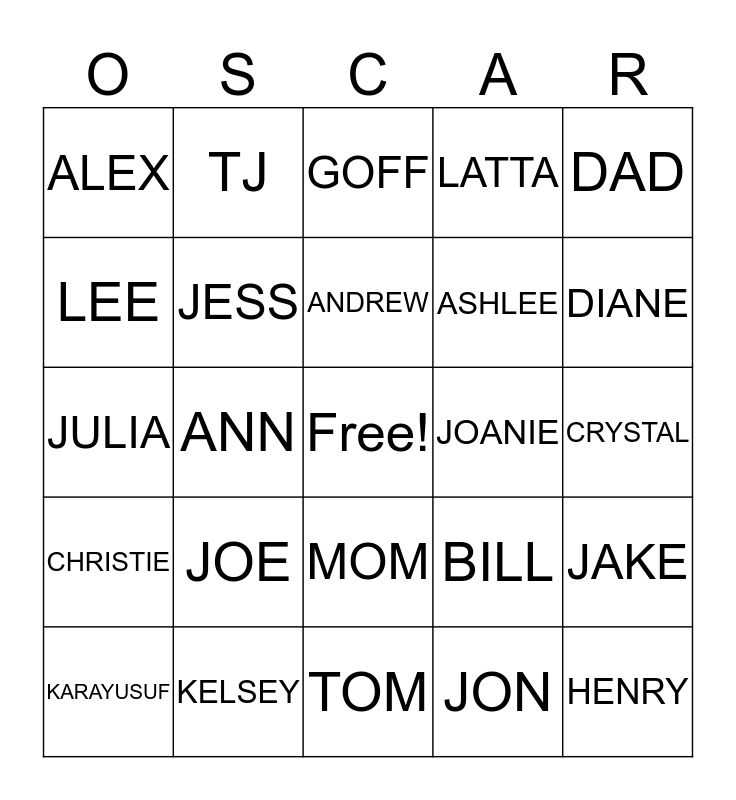 This bingo card has a free space and 24 words: JOE, KELSEY, ANDREW, KARAYUSUF, DAD, ALEX, LEE, TJ, JOANIE, MOM, ASHLEE, JULIA, BILL, JAKE, JESS, JON, CRYSTAL, GOFF, DIANE, ANN, HENRY, CHRISTIE, LATTA and TOM.