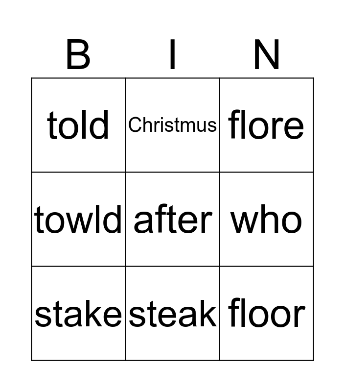 This bingo card has 15 words: find, wild, flore, told, steak, after, clime, climb, who, floor, Christmas, towld, stake, Christmus and fined.