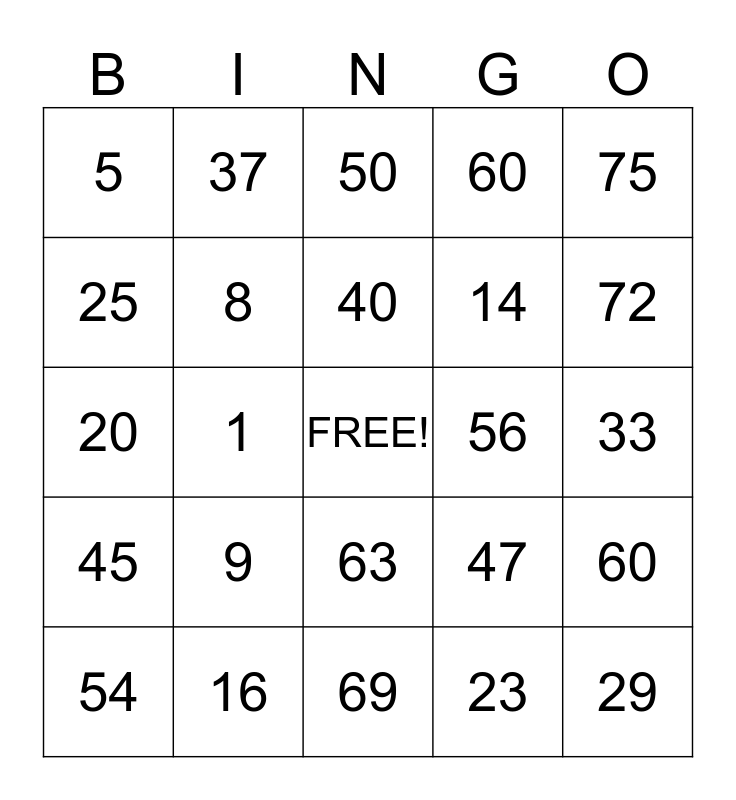 This bingo card has a free space and 24 words: 9, 16, 40, 54, 75, 5, 25, 37, 56, 63, 14, 20, 47, 60, 8, 23, 33, 50, 72, 1, 29, 45, 60 and 69.