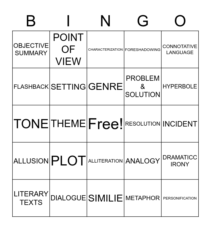 This bingo card has a free space and 29 words: LITERARY TEXTS, INFERENCE, THEME, CENTRAL IDEA, OBJECTIVE SUMMARY, CHARACTERIZATION, SETTING, PLOT, RESOLUTION, DIALOGUE, INCIDENT, PERSONIFICATION, SIMILIE, METAPHOR, HYPERBOLE, IDIOM, ALLITERATION, ALLUSION, CONNOTATIVE LANGUAGE, TONE, ANALOGY, CAUSE & EFFECT, PROBLEM & SOLUTION, FLASHBACK, FORESHADOWING, POINT OF VIEW, DRAMATICC IRONY, GENRE and ALLUSION.