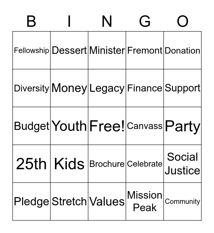This bingo card has a free space and 34 words: Founders, Mission Peak, Silver, Gold, 25th, Money, Donation, Pledge, Dessert, Future, Legacy, Minister, Gifts, Giving Guide, Canvass, Support, Stretch, Budget, Kids, Celebrate, Brochure, Reflect, Fellowship, Party, Values, Community, Fremont, Balance, Finance, Diversity, Sunday, Youth, Social Justice and Goals.