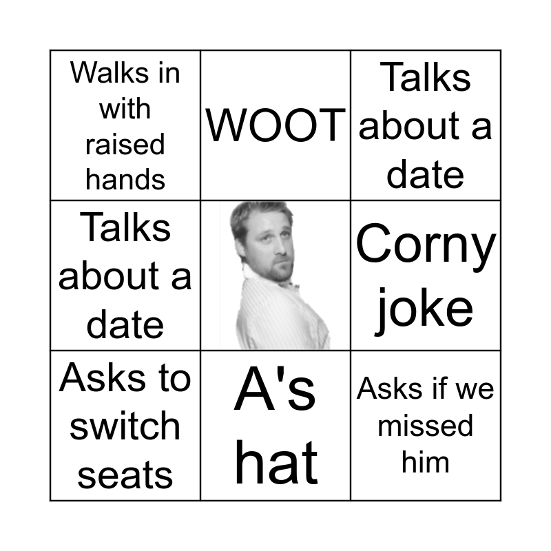 This bingo card has a free space and 11 words: Pastel button up, A's hat, Asks if we missed him, Asks to switch seats, WOOT, Talks about a date, Corny joke, Hungover, Talks about a date, Walks in with raised hands and Cartoon t-shirt.