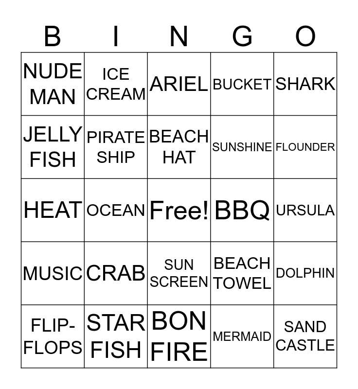 This bingo card has a free space and 24 words: CRAB, STAR FISH, BEACH HAT, FLIP-FLOPS, SHARK, NUDE MAN, JELLY FISH, ICE CREAM, BBQ, SUN SCREEN, SUNSHINE, HEAT, BEACH TOWEL, DOLPHIN, PIRATE SHIP, MERMAID, URSULA, ARIEL, FLOUNDER, OCEAN, SAND CASTLE, MUSIC, BUCKET and BON FIRE.