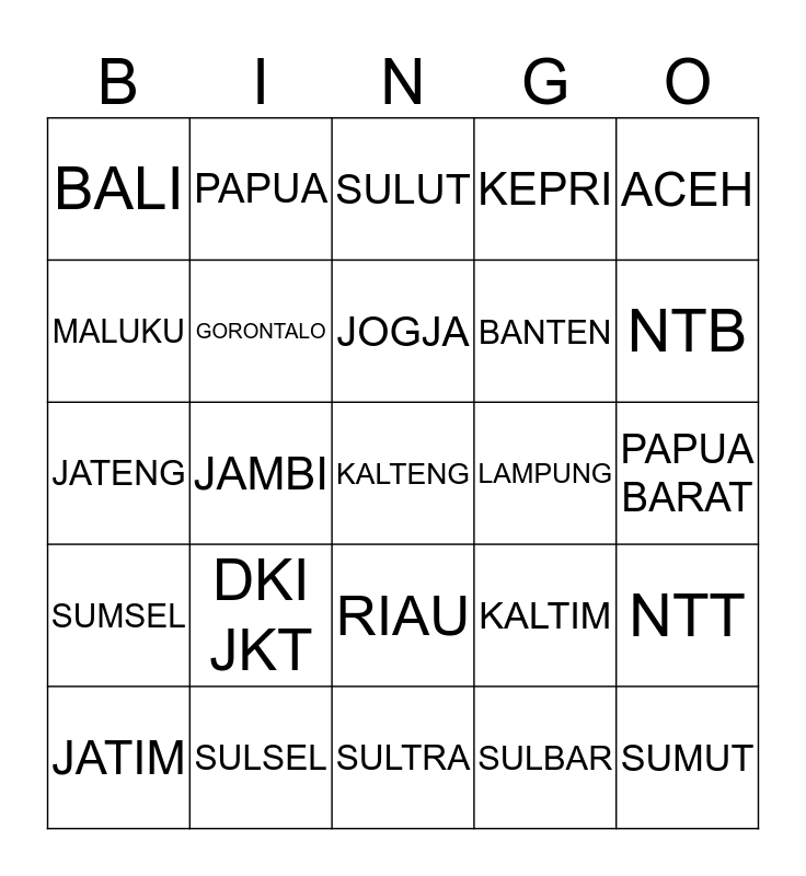 This bingo card has a free space and 24 words: DKI JKT, SULSEL, JOGJA, JATIM, ACEH, BALI, MALUKU, PAPUA, LAMPUNG, RIAU, BANTEN, JATENG, KALTIM, NTT, GORONTALO, SULBAR, PAPUA BARAT, SULUT, NTB, JAMBI, SUMUT, SUMSEL, KEPRI and SULTRA.