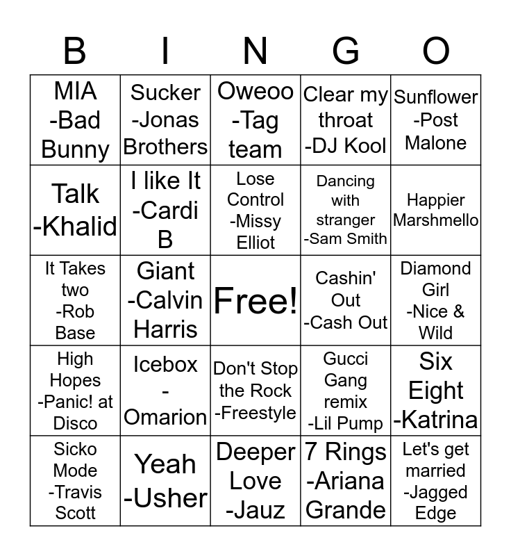 This bingo card has a free space and 34 words: In a Dream -Rockell, 7 Rings -Ariana Grande, Money -Cardi B, Taki Taki -DJ Snake, High Hopes -Panic! at Disco, I like It -Cardi B, Sunflower -Post Malone, Sicko Mode -Travis Scott, Sucker -Jonas Brothers, Spring love -Stevie B, Lose Control -Missy Elliot, Oweoo -Tag team, Lost Yall mind -Kilo, It's Automatic Debbie Deb, Cashin' Out -Cash Out, Happier Marshmello, Yeah -Usher, It Takes two -Rob Base, Icebox -Omarion, Gucci Gang remix -Lil Pump, Don't Stop the Rock -Freestyle, Bodak Yellow -Cardi B, MIA -Bad Bunny, Diamond Girl -Nice & Wild, Deeper Love -Jauz, Let's get married -Jagged Edge, Clear my throat -DJ Kool, Bodies -Drowning Pool, Dancing with stranger -Sam Smith, Talk -Khalid, thank u, next -Ariana Grande, Giant -Calvin Harris, Six Eight -Katrina and Pack Jam -Freestyle Project.