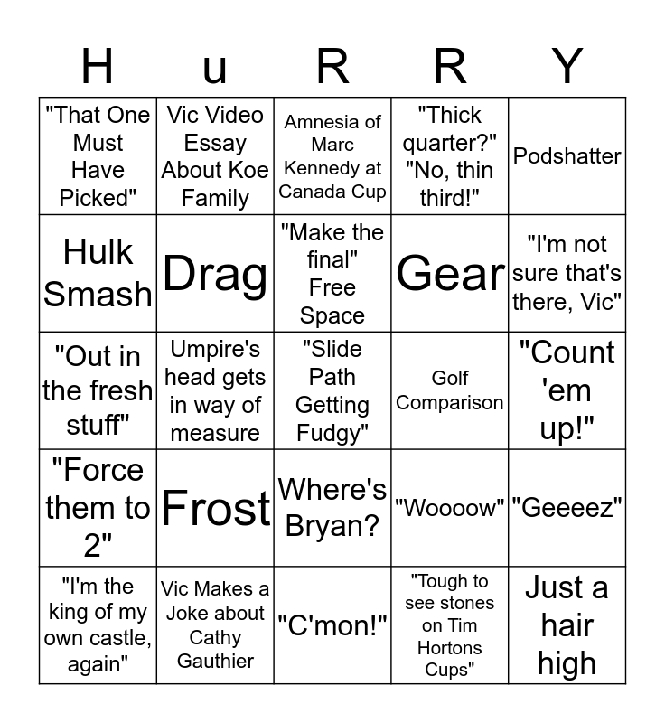 This bingo card has 25 words: "Force them to 2", Vic Makes a Joke about Cathy Gauthier, "Slide Path Getting Fudgy", "Tough to see stones on Tim Hortons Cups", Podshatter, "That One Must Have Picked", Vic Video Essay About Koe Family, Amnesia of Marc Kennedy at Canada Cup, Golf Comparison, "Geeeez", Hulk Smash, Drag, "C'mon!", "Woooow", "I'm not sure that's there, Vic", "I'm the king of my own castle, again", Umpire's head gets in way of measure, "Make the final" Free Space, Gear, "Count 'em up!", "Out in the fresh stuff", Frost, Where's Bryan?, "Thick quarter?" "No, thin third!" and Just a hair high.